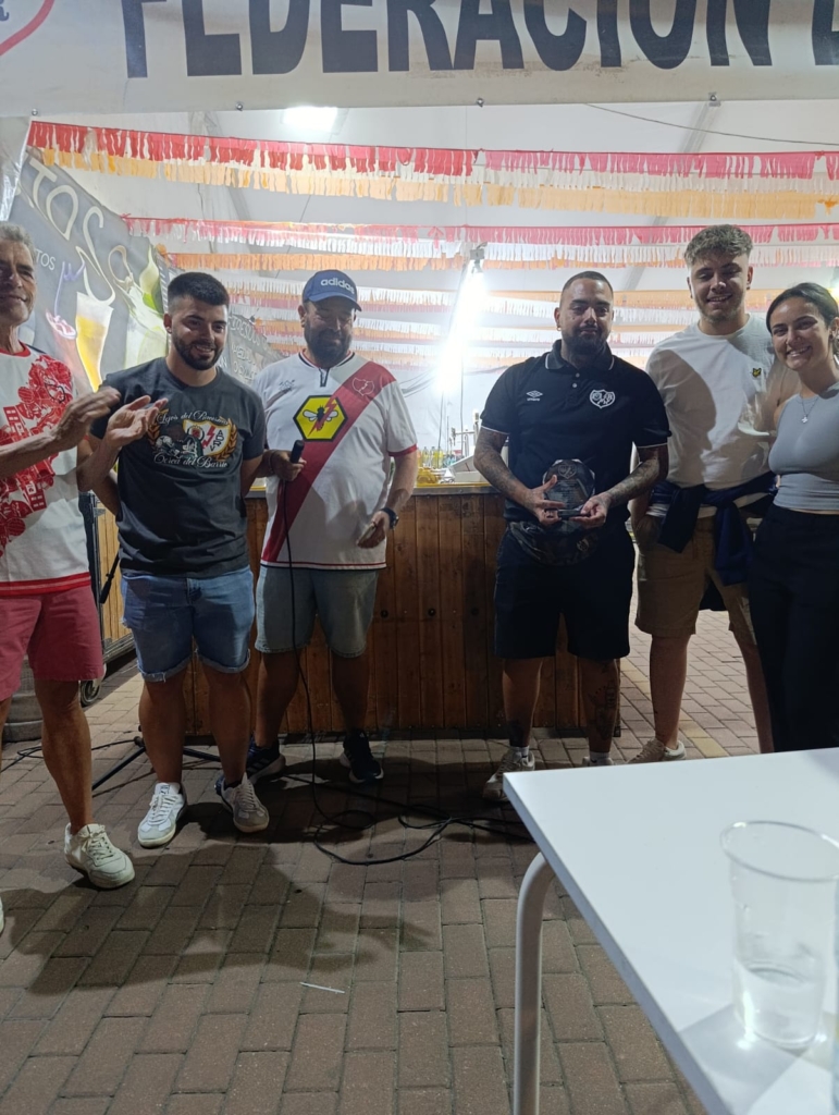 En tercer lugar llegó el turno para Bukaneros. La Federación de Peñas reconocía la labor del grupo durante todos estos años, pero con mención especial a este último. El Centenario ha sido el que es y no ha caído en el más absoluto de los olvidos, gracias a un trabajo espectacular de mucha gente, que ellos han capitaneado en cierta medida. Un año cargado de actos rayistas desde que comenzara con la entrega de brazaletes a los capitanes del Rayo Vallecano, y que tuvo como colofón los Premios del Centenario. Diego, uno de los representantes del grupo que acudió a recibir el premio, destacaba precisamente el orgullo de haber podido llevar a cabo un acto como aquel, en el que se rindió homenaje a los 50 socios más antiguos del club. Tras un año especial por el Centenario llega otro no menos especial con el regreso a Europa 25 años después, algo para lo que el propio Diego afirmaba estar preparados y con más ganas que nunca de seguir siendo la brújula y el timón del Santa Inés por los puertos europeos que nos toquen surcar. Además, tuvo un cariñoso recuerdo para Ramón, recientemente fallecido. Lo que a día de hoy es el Puerto de Mar y anteriormente fue el Seyda, para muchos de nosotros siempre será «el Ramón*, aquel lugar de encuentro rayista, en el que te acogían como si hubieses estado allí parando toda la vida.